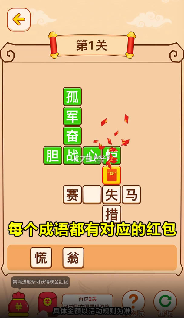 可以体验到最正宗的成语魅力的闯关类答题手游,超海量的题库,超丰富的挑战玩法,每一次闯关都是一次全新的知识上的挑战,游戏中玩家不仅可以复习到好多都快遗忘掉的成语,还可以借着复习的空获取到游戏送出的红包奖励,通关就可以拿红包哟!
