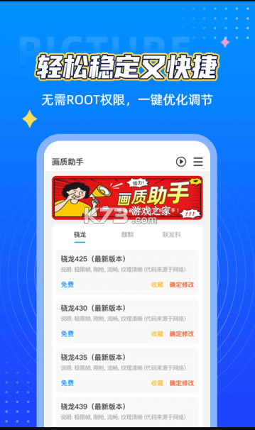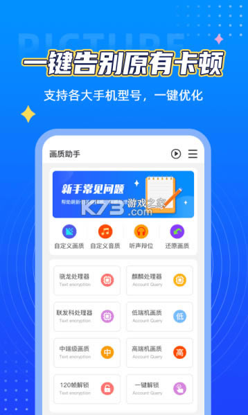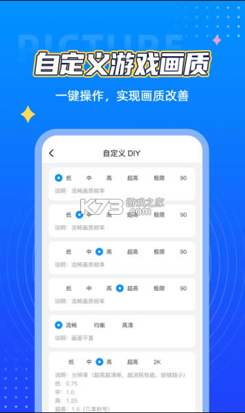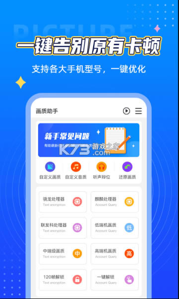 这是一款非常优质的游戏辅助工具,有了这款软件用户可以轻松吃鸡,很多朋友因为游戏画质的拉胯而看不到敌人,本款软件适配所有机型,轻松帮助用户提升游戏画质,满足用户所有需求,而且办款软件是非常正规安全的,用户可以放心使用