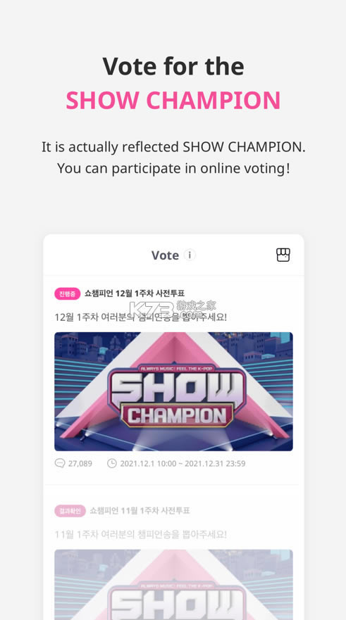 为韩国的《Show Champion》节目打造的官方投票客户端应用,中文名字又叫做冠军秀app,利用Idol Champ app寻找冠军秀入口,选择自己喜欢的歌曲,轻松松松为你喜欢的偶像投票,助ta登上冠军的宝座,并且还能观看现场直播