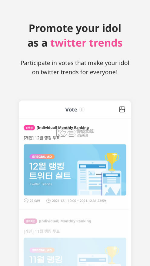 《idolchamp(冠军秀)》是一款韩国非常火爆的选秀类节目的官方投票资讯平台,用户们在软件中可以为自己喜欢的韩国欧巴投上自己宝贵的一票,帮助他最终登上舞台的冠军宝座。