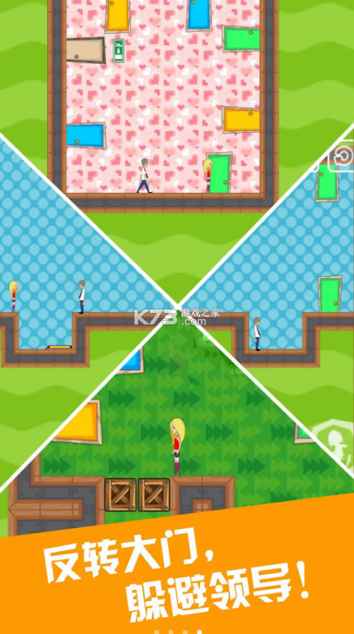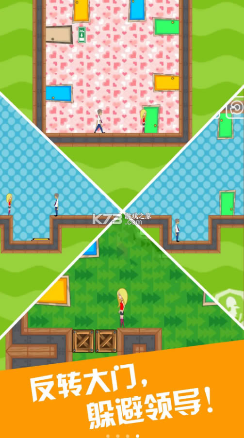 这是一款非常刺激的益智逃脱类游戏,玩家们将扮演一名公司职员,利用巧妙的身法,发挥你们的最佳想象力来躲过一个个的办公室,不要被其他人发现你要逃离公司。在一个又一个暗门当中往返,帮助他找到正确的出口,逃离办公室吧!游戏中要小心一个又一个的办公室经理,不要被他们发现,还要及时的接住他们的力量巧妙的离开办公室!!!
