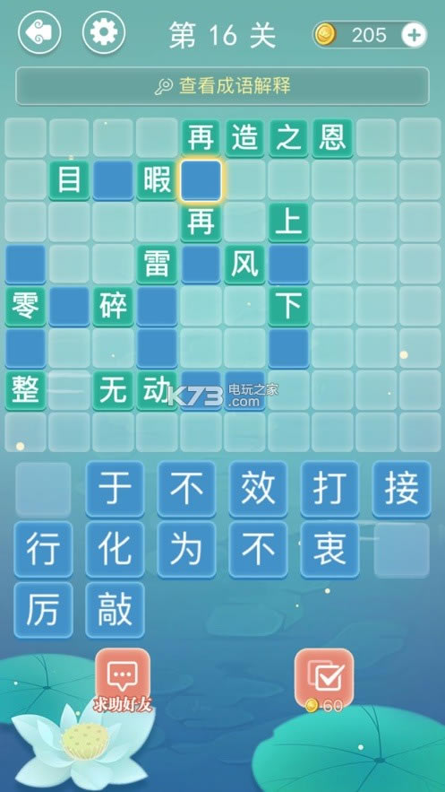 1、简单的成语拼接游戏,考验你的词汇量,完成棋盘的测试,获得更高分数;