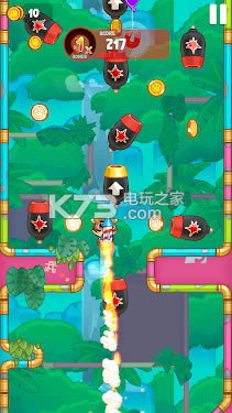 《丛林爆炸(Jungle Blast)》游戏的玩法十分简单,你将通过控制大炮来发射角色,把握好时机不断向上进行飞跃,沿途有着各种功能的道具和金币,你需要来收集它们。
