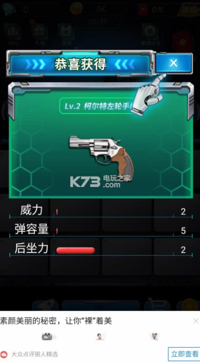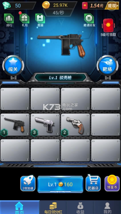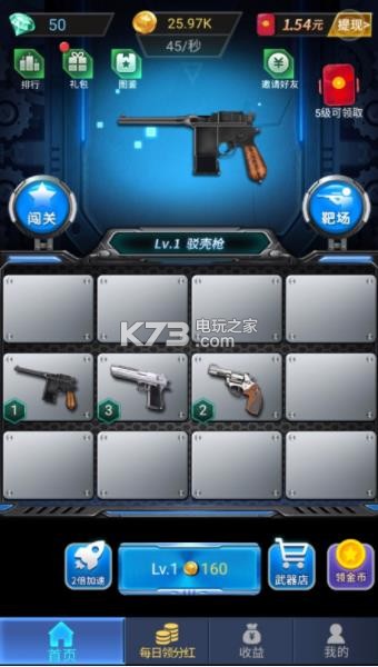 3、看广告可以获得金币,闯关赛与靶场射击也可以获得金币,枪支本身也可以产金币,有了金币再买新枪,依次合成升级