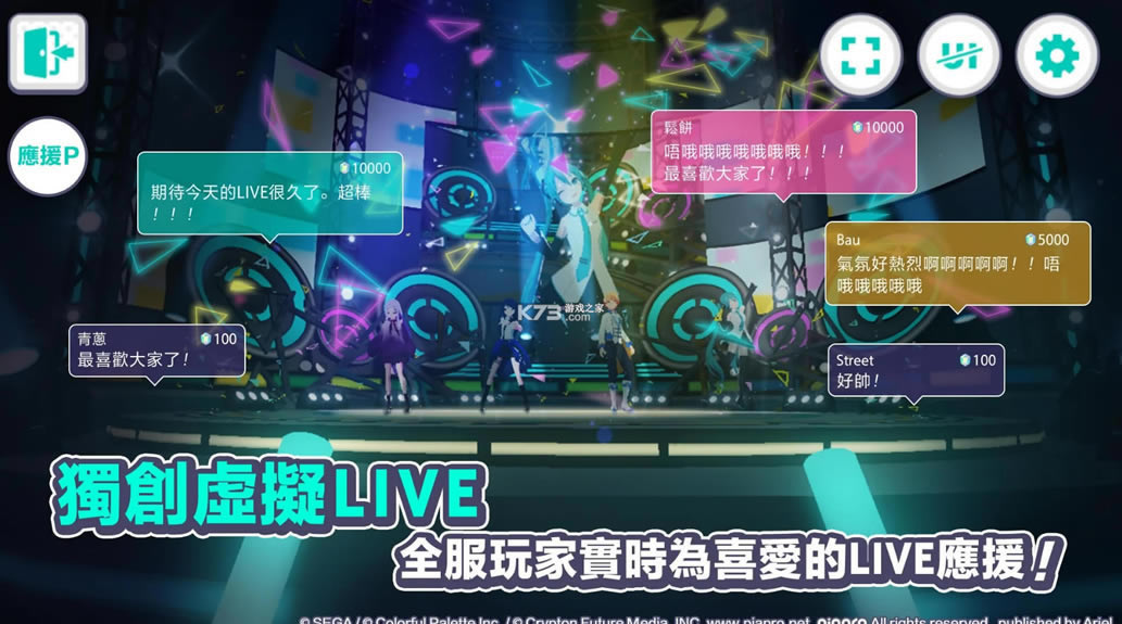 快和虚拟歌手们一起,发掘少年少女们的心愿,登上「世界」的舞台吧!游戏中你将邂逅「人气虚拟歌手」,收听「丰富的人气VOCALOID曲库」,享受「视听一体的感官盛宴」,获得「耳目一新的绝佳音游体验」,在「虚拟LIVE」中结识朋友,还有更多惊喜在等你发掘。