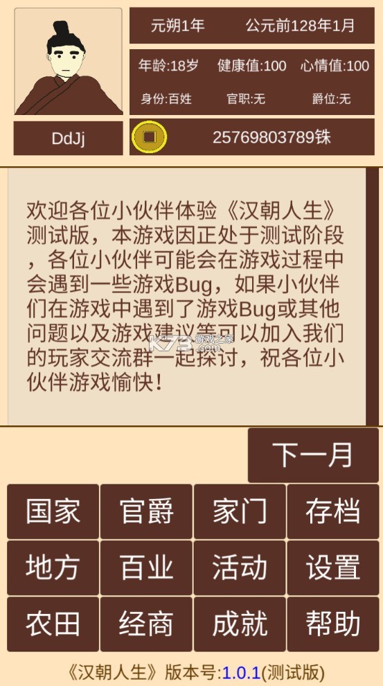 非常好玩的文字游戏,游戏主体和人生重开模拟器玩法类似,玩家在游戏中穿越到汉朝,通过不同的选择来发展不一样的人生,从而在汉朝扎根立足