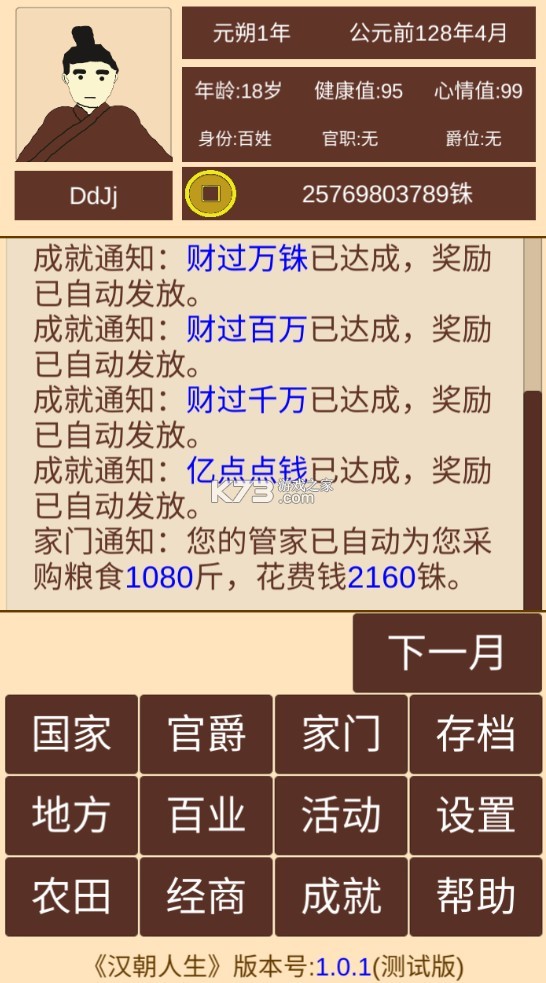 非常有意思的文字游戏,在这款游戏中玩家们将会穿越回到汉朝开始你的全新人生,在这个朝代之中你的每一次选择都将会成就不一样的人生,在这里你还可以体验到非常丰富的人生经历,你的命运也就此掌握在你的手中,每次选择都要慎重