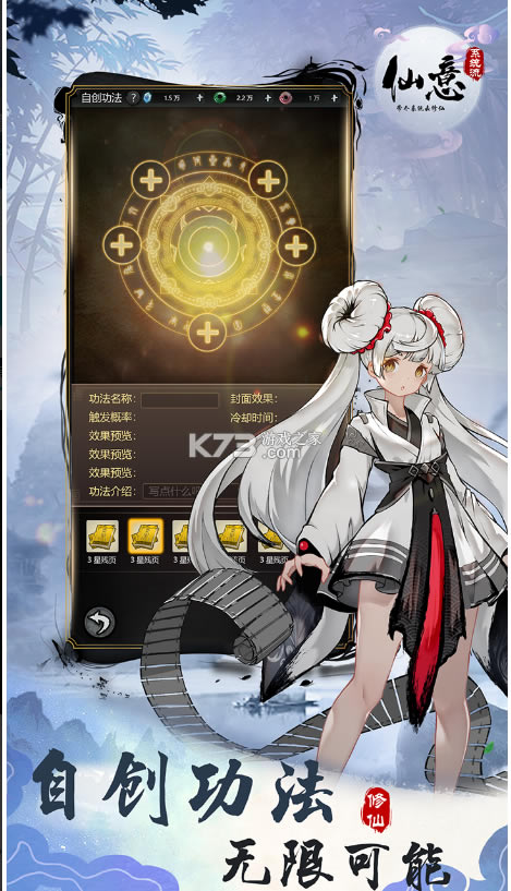 你可以选择不同的功法封面和残页,来创造不同效果的功法,自由命名和写相应的功法介绍。甚至可以在宗门的藏经阁共享你的强大功法给其他弟子学习,以此来获得相应收益。在你飞升后,你的强大功法依然会流传下去,你作为该功法的创造者,命名者,将成为修仙界广为流传的传说。