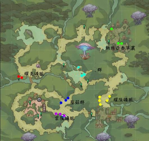 新地图的星屑花丛、纳维亚香草丛、蘑菇群可以採到新的食材,可用来做70级的食物,目前新地图一张各有叁种矿物以及叁种食材,另外新地图的矿物似乎要用「秘银十字镐」(一般的十字镐无法使用哦),有新发现会在随时补充。