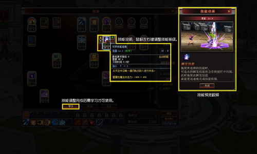 2、打开技能窗口,点击技能图标可查看技能说明,左右两侧按钮可提升或降低技能等级。