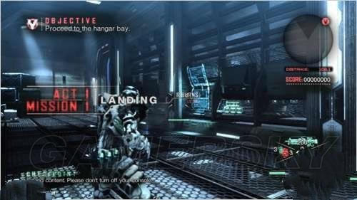 顺着阶梯往上走并击倒敌人,来到一个半环状的广场。广场远处有两台步行机甲与数座炮台,玩家可以利用上楼后右前方的狙击枪(Sniper Rifle)从远处清掉驾驶,或是直接前冲,利用步枪近距离除掉他们以及广场中央的部队。玩家可以花点时间在这里练习运用AR Mode(A键翻滚/LB键冲刺/X键翻墙时按住LT键不放)以及掌握装甲服的热量控制,对于之后的攻略有很大的帮助。