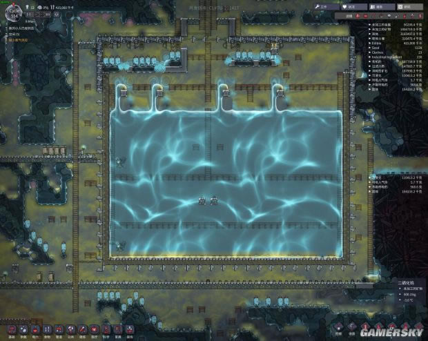 蒸汽喷泉是个好东西,但水温太高冷却很麻烦,第一次蓄水还好,开挖水池时大量低温材料都在水池底部,降温很快,但第二次蓄水900吨后,温度高达60多度,只能读档改造水池。经多次尝试,发现了一个奇怪的bug,这个bug应该是两种液体碰撞导致的,可以使巨型蓄水池瞬间降温。