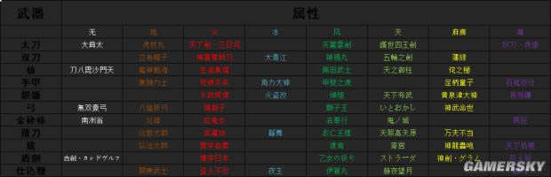 无属性——最基础武器→モノノフ制式·鬼X→モノノフ特式·X影→魂武一段→魂武二段。
