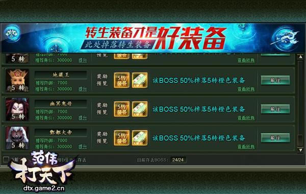 而3转及以上的BOSS,将会有不同的几率掉落不定等级的橙装。也就是如果你击杀5转BOSS,你将有50%几率获得5转橙装,而另外50%的几率,将会获得5转以下的橙色装备。