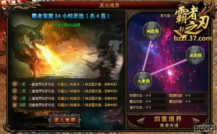 战士可以到37《霸者之刃》的真元境界中获取高级装备,它共分为四境:炼精化气、炼气化神、炼神化虚、炼虚合道。每一境有三期,只有在完成该境界的第一期之后,才算真正达到该境界!达到某层境界后,玩家可进入属于该境界的专属地图——霸者宝窟。点亮每一期需要消耗真元值,升级境界还需消耗金刚石,真元值可以通过进入霸者宝窟杀怪获得!提升真元境界最大的好处就是可以进入相应的霸者宝窟层数,击杀BOSS获取高级别装备,这也是很多玩家追求的重点玩法!