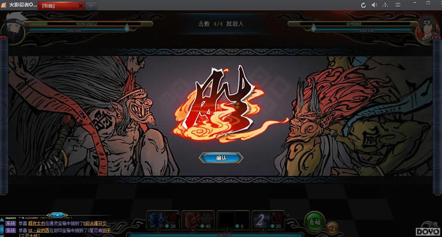 第四关:第三关打的好的话,第四关是满血的,对面的大招是打不死你的。上来就点伊鲁卡的技能,这个时候有很大几率鼬会只混乱伊鲁卡一个,然后大小猪放奥义,雷主雷凯四刀,轻松解决。鼬的奥义混乱到雷主也没事,大小猪秒死佐助跟鼬毫无鸭梨,因为前面已经养的很肥了,奥义打一万多,普攻一下四五千,轻松过关拿东西~~