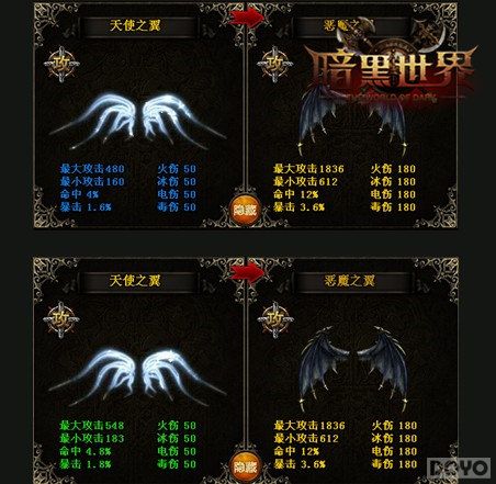 翅膀升阶:37《暗黑世界》中翅膀可以通过消耗“神之泪”进行升星和升阶,升阶后的翅膀可以永久获得更酷炫的外观。每个翅膀需要升星5次,升星后会获得永久的“攻击属性”提升,下图便是翅膀升阶前后属性的变化(蓝绿对比)。当翅膀升满5星后,就可以自动升阶为更高级的翅膀!解锁更华丽的翅膀外观!
