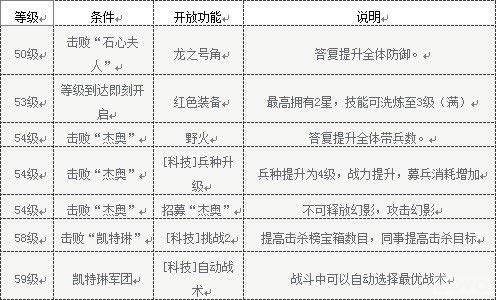与之前的等级阶段相同,在37《怒火燎原》中如果玩家等级达到50级,也会有这一阶段需要特别关注的游戏功能,这一阶段最关键的游戏功能包括龙之号角、红色装备、野火、新武将以及新科技技能的提升,具体用途参照上图所示。