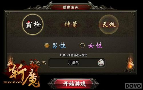 玩家进入37《斩魔》后,可以根据喜好选择自己的区服,点击进入区服后,会来到斩魔的游戏界面——创建角色。游戏中的角色有两种性别(男/女),三种职业(霸枪/神箭/天机)。下面就来对三种职业进行简要介绍,玩家可以根据自己对职业角色的喜爱程度进行个性选择。