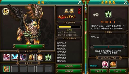坐骑初始为一阶时只有一个技能,随着坐骑升阶之后会开放剩余技能,当坐骑达到6阶时开放全部技能。技能升级需要使用“坐骑技能丹”,当达到升级所需个数和指定铜钱,便可以点击“技能升级”从而升级技能,也可以点击“自动升级”让坐骑等级到达下一级别,技能升级也是有概率失败的哦。