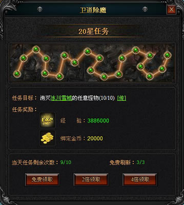 卫道除魔任务:37《七杀》卫道除魔任务为可刷新星级任务,最高为20星级,每次刷新消耗5W绑定金币,星级越高,奖励越丰厚哦,使用元宝可进行双倍和4倍领取!