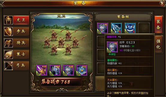 2.兵种装备分为:龙卫装备、步兵装备、骑兵装备、策士装备、弓兵装备