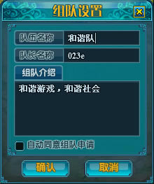 1. 设置,队伍所有成员皆可用。队长点击打开队伍设置界面,队员点击打开队伍资料界面。组队设置可以修改队伍名称和队伍介绍以及自动同意组队申请,选择自动同意组队后,若其他玩家发送申请组队邀请且队伍有空闲位置时可以直接加入队伍,组队设置功能只有队长才能使用,如下图:
