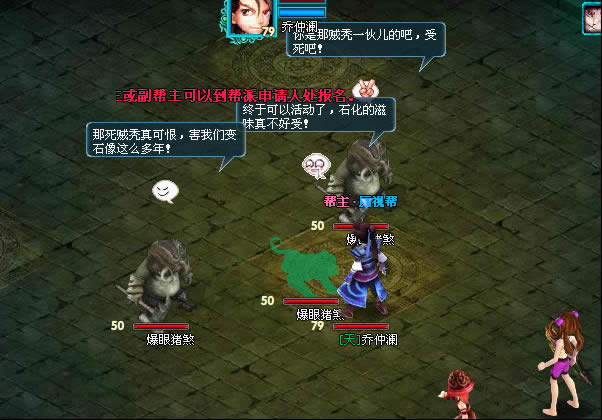 第三阶段:生命值少于50%的时候,施放石化禁锢技能,目标以及周围1格内的玩家将被石化,无法移动,并且持续受到伤害,且伤害会越来越大,持续3回合,此外,还会施放终极技能:末日浩劫(全屏玩家受到火焰伤害),这里如果血量和防御不够的话小心容易被秒哦。值得注意的是:该Boss自身带反伤被动技能,反所有伤害,让人头疼,伤害太高的话会把自己弄残了。没奶妈的话,就带足够的药吧。
