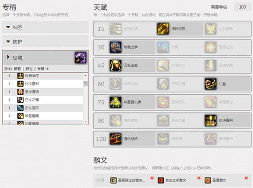 天赋选择:法网恢恢、制裁、无私(圣洁护盾)、仁慈、神圣复仇者、处决宣判、圣印舞。