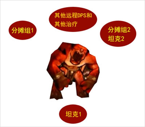 如上图:坦克1嘲讽boss,坦克2站在分伤组2.当boss能量条满时便会读条引导第一次分摊,此时坦克1身上叠了3到4层压迫打击,当boss读条后,坦克2嘲讽boss进行第一次分摊;当分摊完毕后,坦克1将boss嘲讽回来,之后坦克2马上来到坦克1的位置接boss,而坦克1马上到分摊1组展位,准备boss能量条满后的第二次分摊。当第二次分摊时坦克1在分伤1组嘲讽boss分摊伤害,之后坦克2将boss嘲讽回来,坦克1来boss面前接boss,坦克2马上到分伤2组准备第三次分伤。