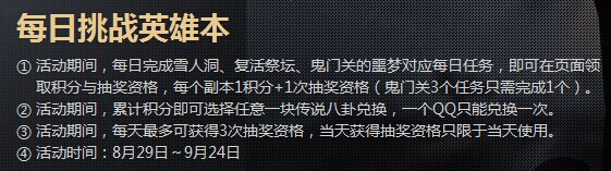 《剑灵》英雄传说活动详解剑灵最近推出了英雄传说活动,挑战英雄本即可领取传说八卦牌,今天小编就来为各位详细分析下该活动的收益。英雄传说活动出来就看见很多同学嚷嚷,说一共27天,根本拿不齐八卦,还有说27天延长一天,至少让我们拿4块八卦,对于这种...2023-08-25 -