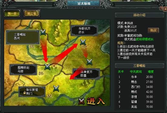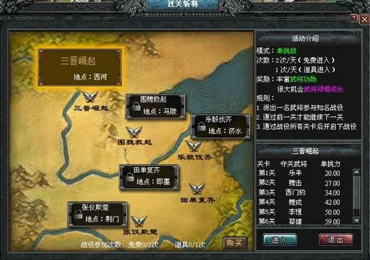 过关斩将 七雄争霸当玩家君主等级达到15级后,就可以参加过关斩将活动,目前过关斩将共推出第一章(5大战役)第二章(4大战役),三晋崛起(共7关)、围魏救赵(共7关)、乐毅伐齐(共7关)、田单复齐(共7关)、张仪欺楚(共8关)、西击匈奴(共8关)、吞并巴蜀(...2025-04-12 -