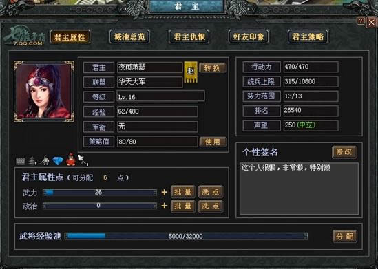 君主介绍 七雄争霸君主介绍君主系统是《七雄争霸》一个重要的养成系统,君主的养成是一个长期持续的养成系统。点击左上角的君主头像或正下方的“君主”按钮可进入君主系统。君主系统包括:君主属性、城池总览、君主仇恨、好友印象、君主策略。君主属性君主等级君主等级上限为...2025-04-12 -