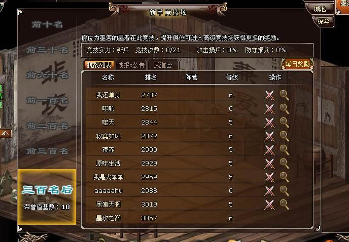 个人竞技及单人战斗 墨门春秋玩家进入游戏后,就会在墨家行馆的里由项少龙指引着进入竞技场。在每一级的竞技场内,玩家会有一个排名,只能攻击排名比自己高的玩家。获胜后可以取代对方的名次并且获得荣誉值的奖励。玩家根据不同的排名会有不同的分段,在排名越靠前的地方攻击获得的奖励...2025-04-12 -