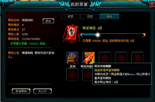 名将传奇 帮派BOSS当您所在的帮派达到4级之后可开启帮派BOSS活动。帮主可以每周设置两个时间段来开启这一活动,该活动类似挑战入魔者,所有当前帮会成员都可以在这一时间段进行击杀,并在击杀过程中获得一定丰富的奖励。帮派BOSS活动奖励:1、对BOSS造成伤害的...2025-01-18 -