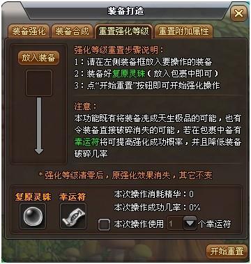 火影世界重置强化等级对装备进行重置强化等级的操作可将装备现有的强化星级归零,需要消耗道具复原灵珠,使用幸运符可以提升操作的成功率。在对装备进行重置操作时,有一定几率获得天生带有星级属性的装备。...2025-04-08 -