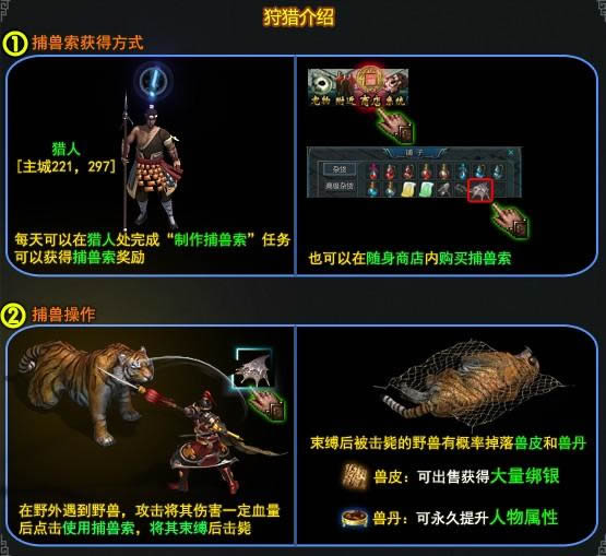 盛世三国狩猎系统捕兽索获得:等级到达25级后,可在主城的孟优处购买“捕兽索”。狩猎流程:狩猎物品:? 狩猎获得兽皮可出售给NPC,获得大量的绑银,兽皮品阶越高出售的价格越高? 狩猎获得兽丹可点击直接使用永久增加人物属性,可在人物属性界面点击野兽丹按钮,查...2025-04-08 -