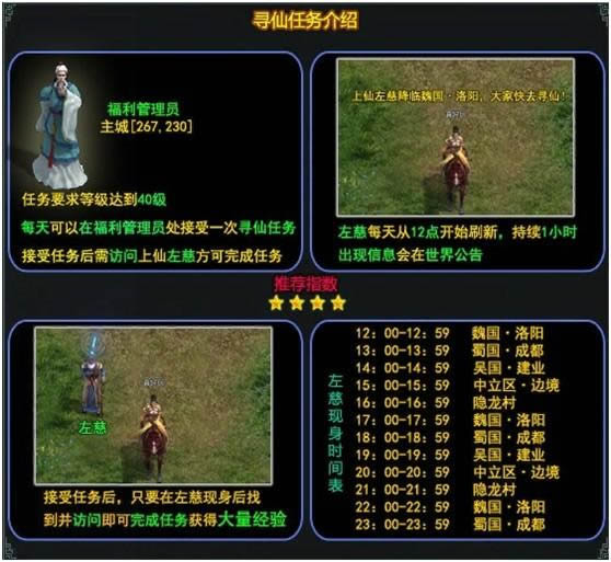 盛世三国寻仙任务介绍:访问随机出现的上仙左慈,每天让你有意想不到的惊喜哦。接取条件:等级大于40级的玩家每天可以在福利管理员处一次寻仙任务。左慈会根据不同时刻在不同地图的任意坐标位置随机刷新:左慈刷新时间 左慈刷新地图12:00~12:59 魏国?洛...2025-04-08 -
