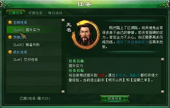 侠客世界任务介绍如果您在进入游戏后,因为宏大的游戏情节和背景所迷茫;或者因为不知道可以做些什么而不知所措;或者是想要偷懒自动寻路,那么您一定会需要这个:侠客世界的任务栏集成了传统的已接任务,可接任务,更创新的增加了每日活动和游戏活动两个栏目。点开游戏下方...2025-04-07 -